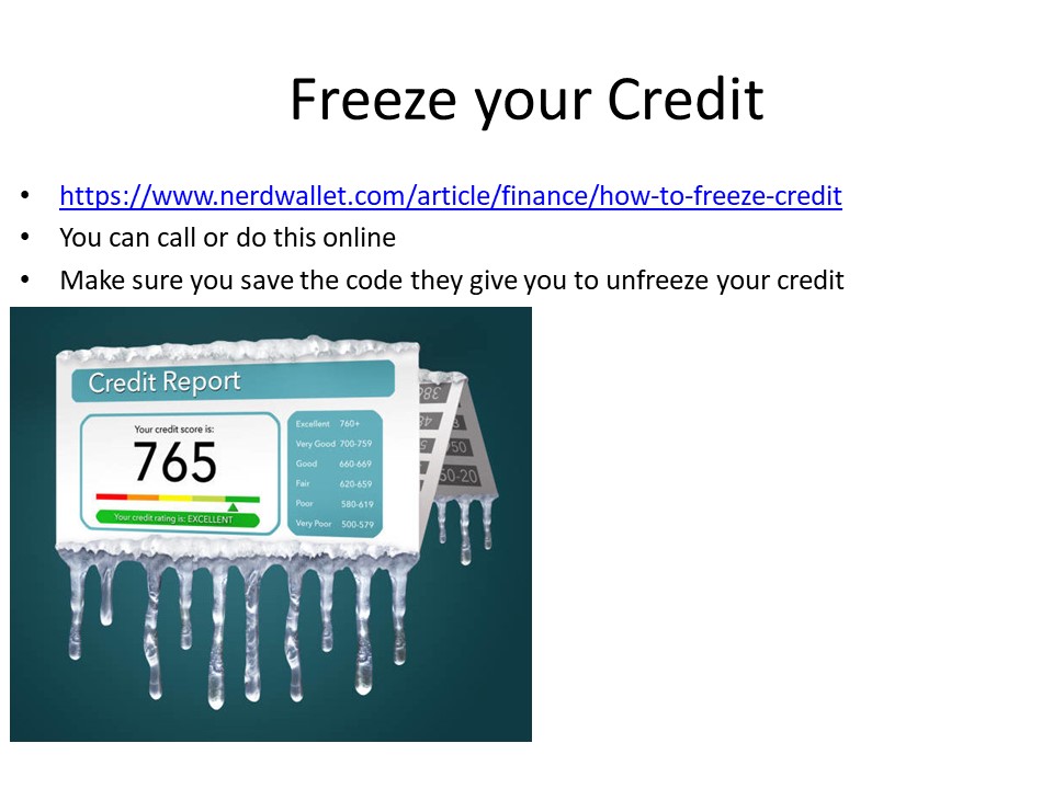 has an article that will walk you through doing the freeze at the 3 major credit bureaus either online or via telephone.A credit freeze makes it much harder for someone to take out a loan using your SSN because the loan company can’t get a credit report from the bureaus with the freeze in place (Of course, if the loan company will loan money without checking with one of the bureaus, that’s a whole different problem).