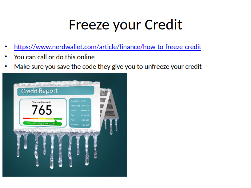 You need to insure that you freeze your credit and the credit of anyone you’re responsible for that has a social security number, even if you/they don’t use credit, because if you don’t, someone else can take out a loan in your name based on the information in this breach. Even my mother’s SSN was in the breach, so I had to go freeze her credit. Be sure you “freeze” your credit, not “lock” it, or sign up for some “identity theft” program (while those work, they cost a not-insignificant amount of money).